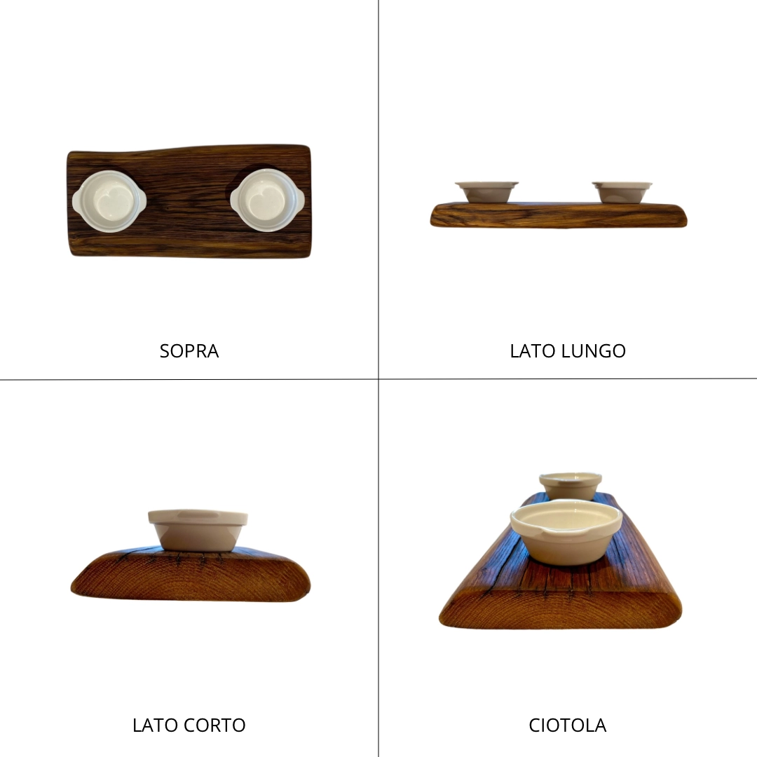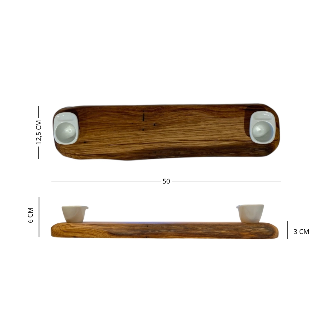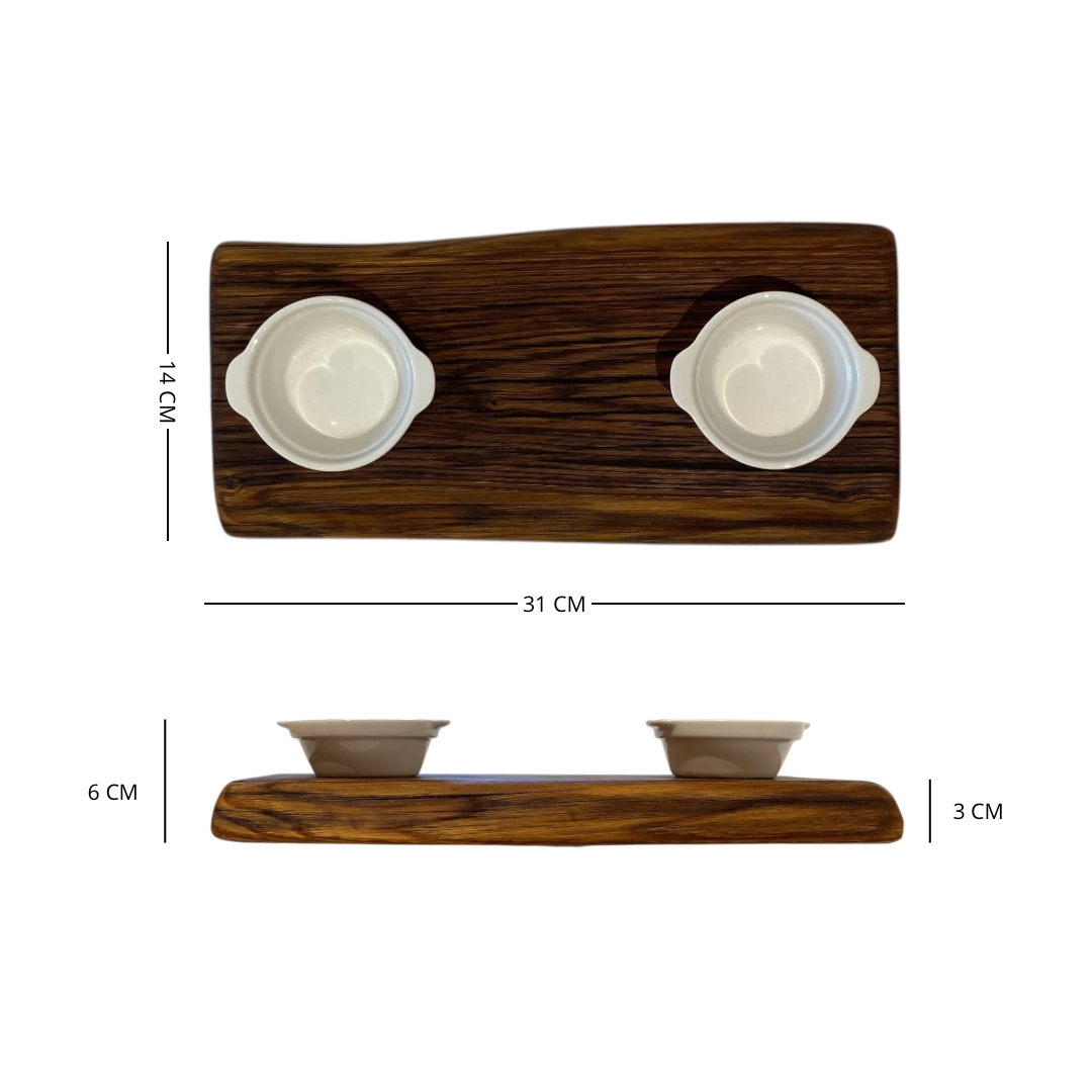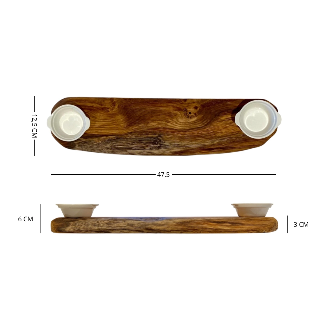 The handcrafted, made of solid antique wood, a piece that combines elegance and functionality, on the sides of the tray, two bowls are positioned, which add a touch of rusticity and contrast to the warmth of the wood. The bowls are perfect for serving dips, making the tray ideal for entertaining guests.