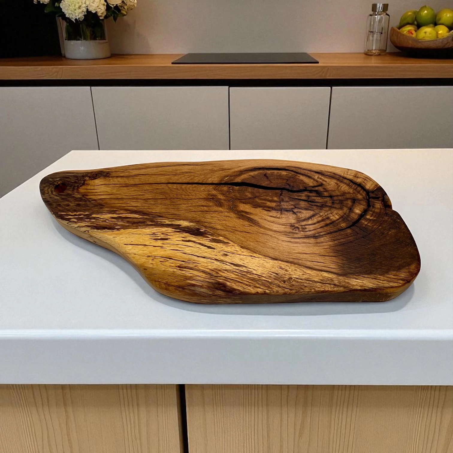 Irregular shaped artisan cutting board made of solid ancient oak wood.