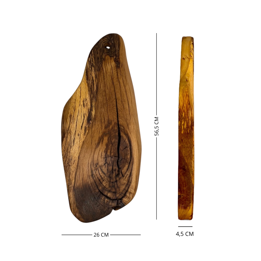 The handcrafted cutting board in solid ancient oak wood, with its irregular shape, is a unique piece that combines functionality and natural beauty. Handcrafted by expert artisans, this cutting board features a sturdy, durable surface, perfect for food preparation and serving. Ancient oak, with its distinctive grain and warm tones ranging from light brown to dark brown, gives the cutting board a fascinating and historic appearance. Each piece is unique, as the irregular shape enhances the natural characteristics of the wood, making it a true artpiece to display in the kitchen or on the table. The craftsmanship guarantees a hand-sanded finish, which makes the surface smooth and pleasant to the touch, while the natural imperfections of the wood add a touch of authenticity. The handcrafted cutting board in solid ancient oak wood is a perfect combination of functionality and design, a piece that tells a story and brings a touch of warmth and authenticity to every home. It is an ideal gift for true foodies and an accessory that enriches every culinary experience.