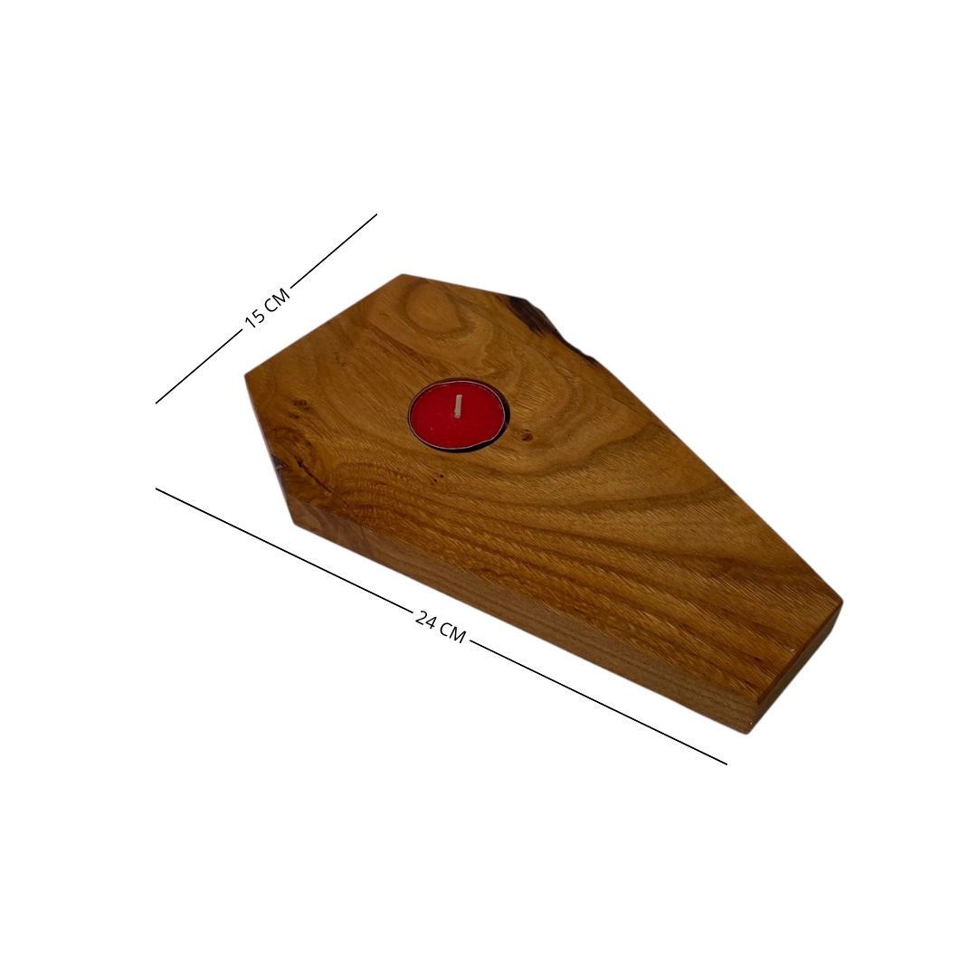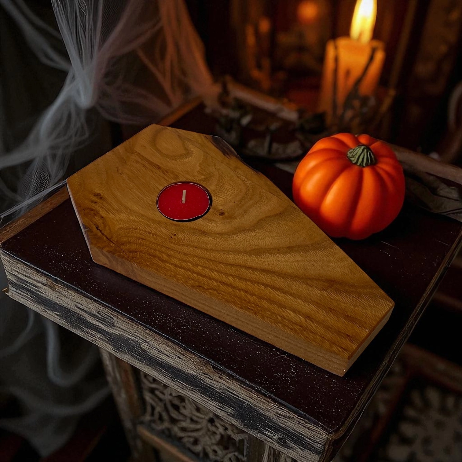 Handcrafted wooden coffin-shaped candle holder with included candle, perfect for Halloween and themed evenings.