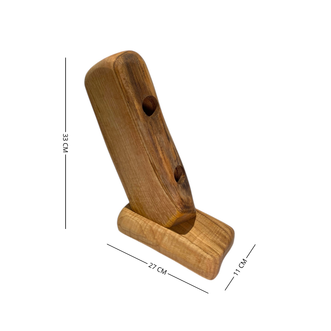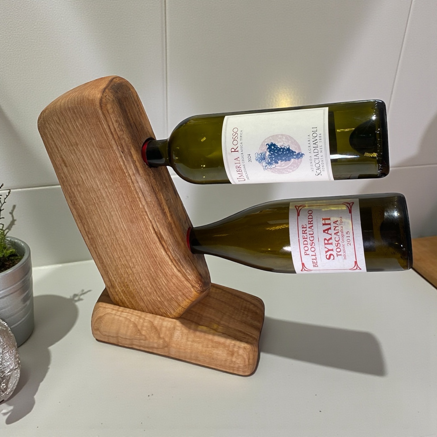 Questo elegante porta bottiglie artigianale in legno massello è realizzato a mano valorizzando la forma irregolare e naturale del legno, rendendo ogni pezzo unico e irripetibile. Pensato per ospitare fino a 2 bottiglie di vino, unisce funzionalità e design rustico, perfetto per arredare con stile cucine, enoteche o soggiorni.