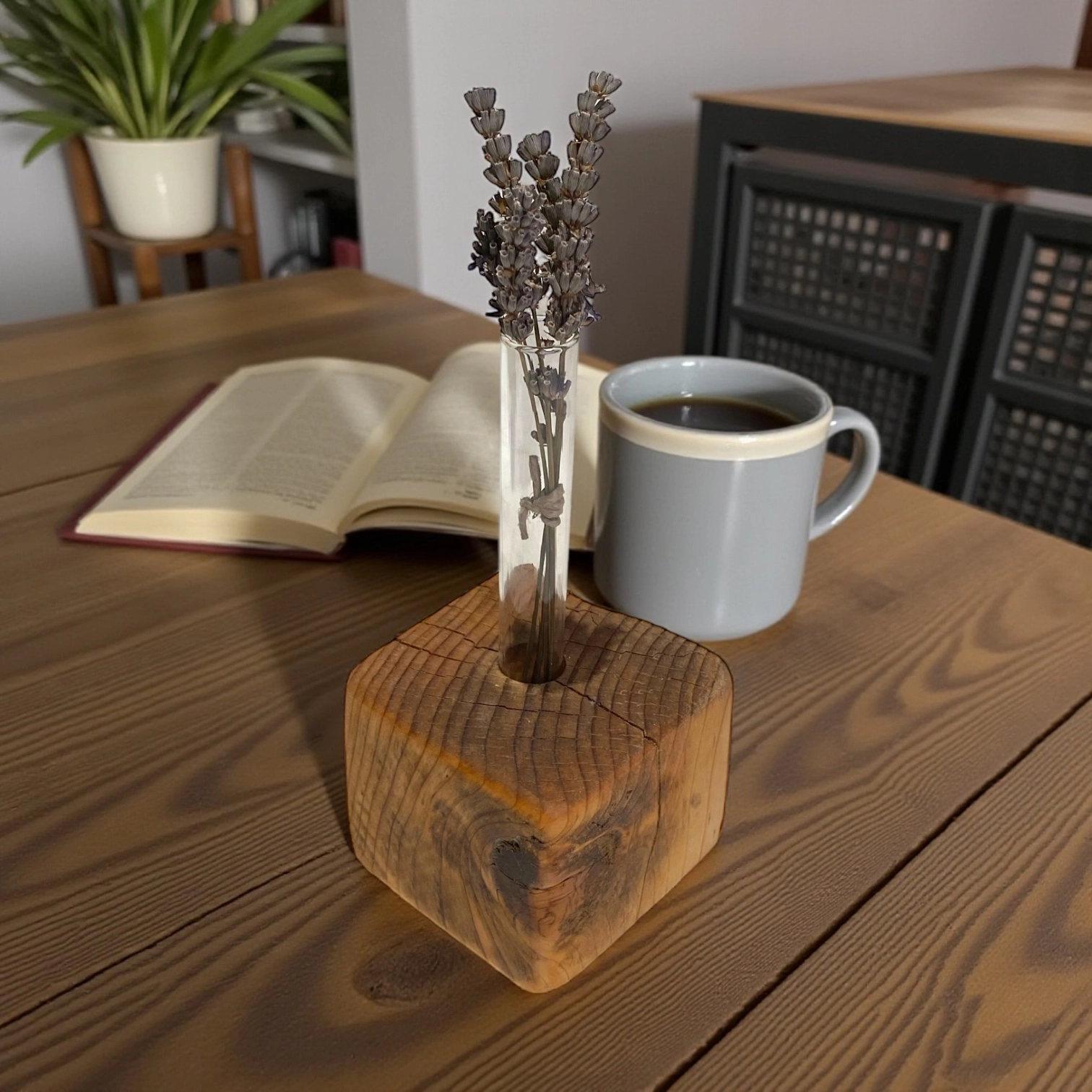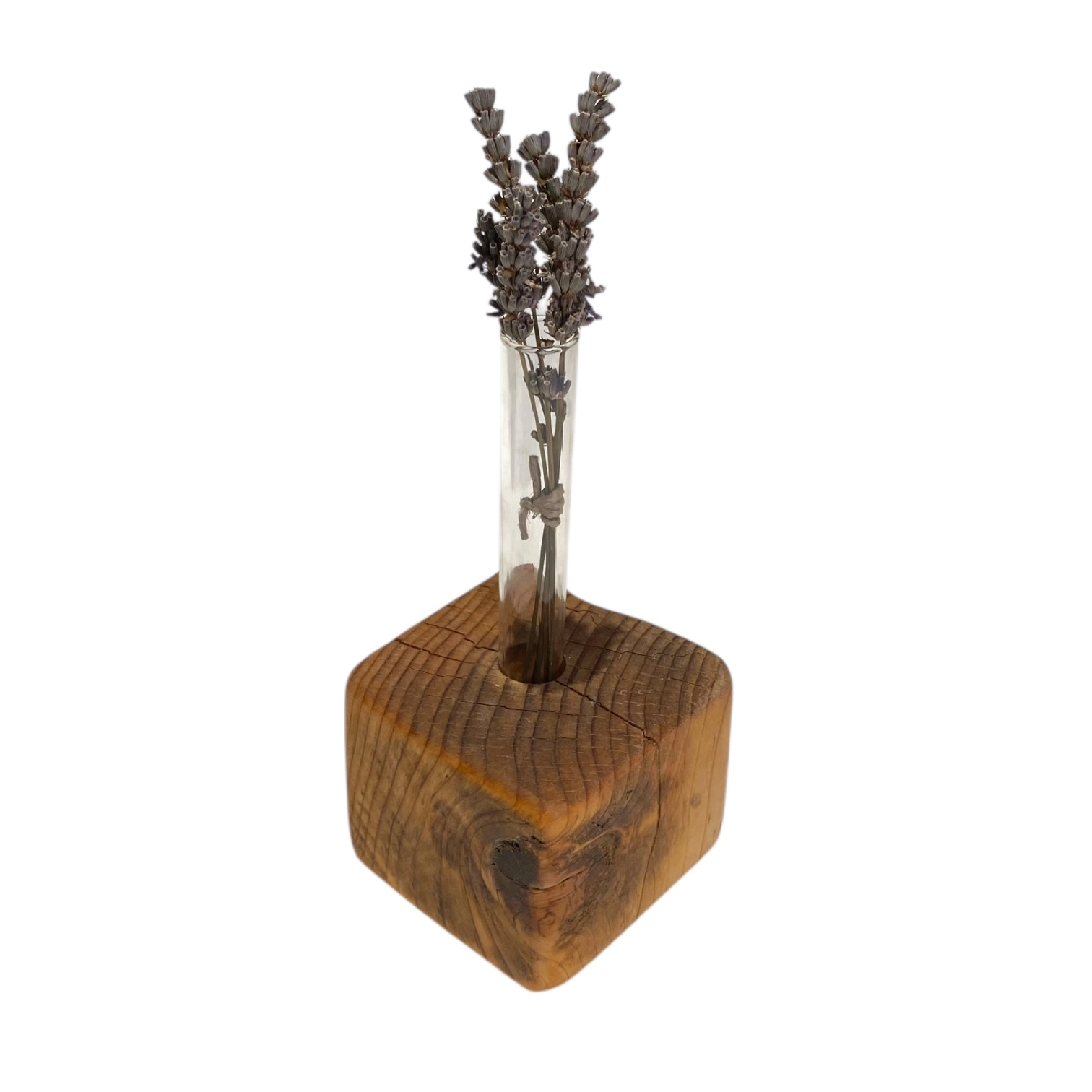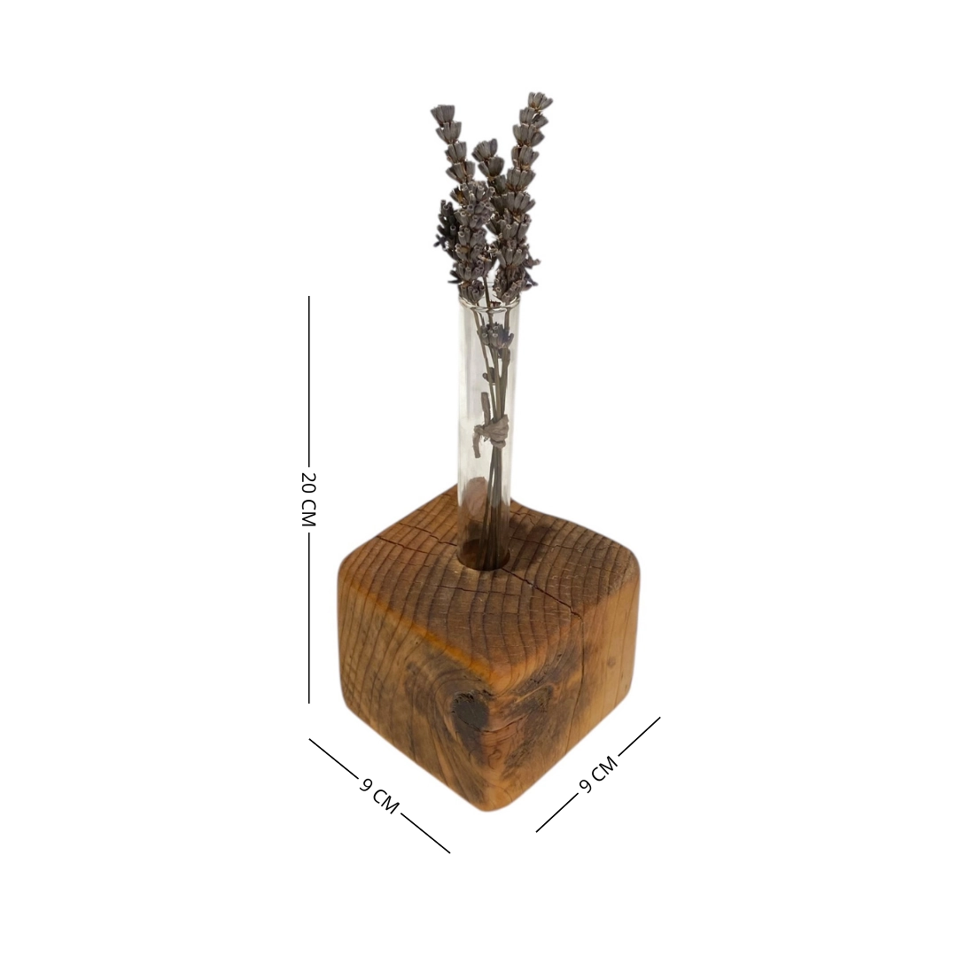 Il blocco in legno è lavorato a mano e mantiene una forma irregolare autentica, valorizzata da venature marcate, nodi e piccole crepe che rendono ogni pezzo unico. L’ampolla in vetro trasparente è inserita direttamente nel legno e può essere utilizzata per fiori secchi, rami decorativi o come contenitore per profumatori d’ambiente con bastoncini.