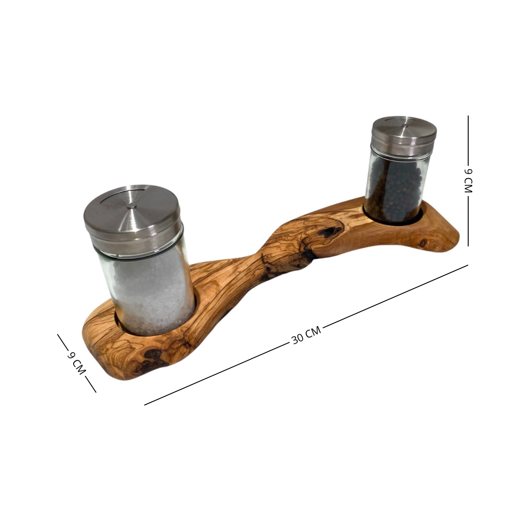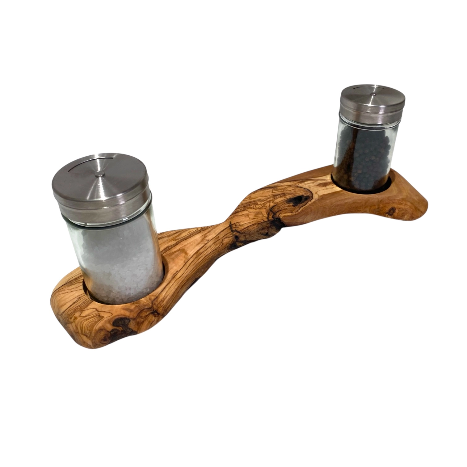 Porta sale e pepe in legno massello di ulivo con base dalla forma irregolare naturale e contenitori in vetro con tappo in acciaio.