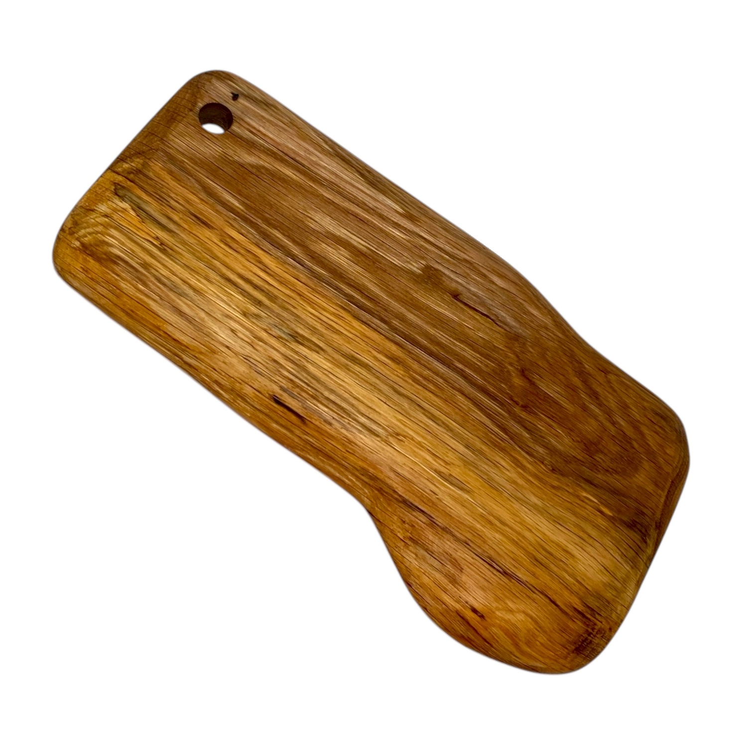 Tagliere artigianale in legno massello di quercia dalla forma irregolare.