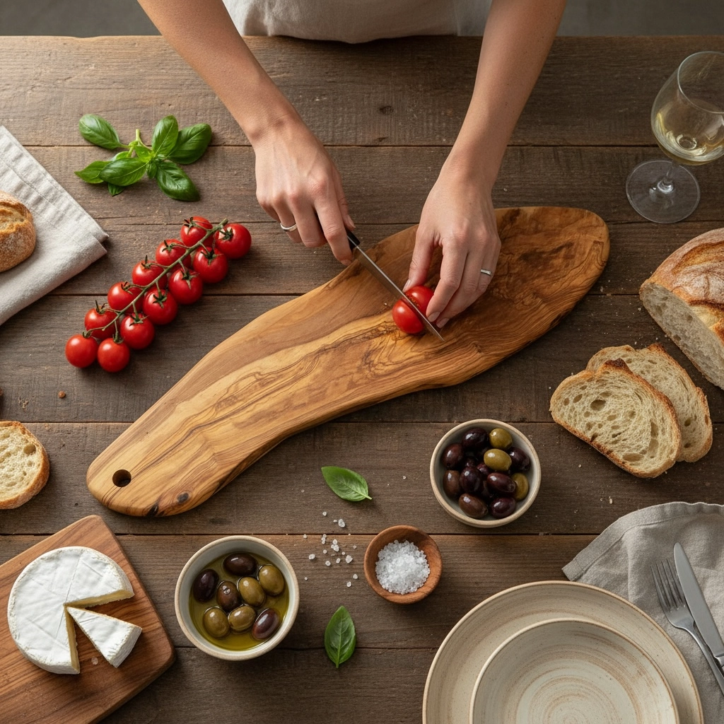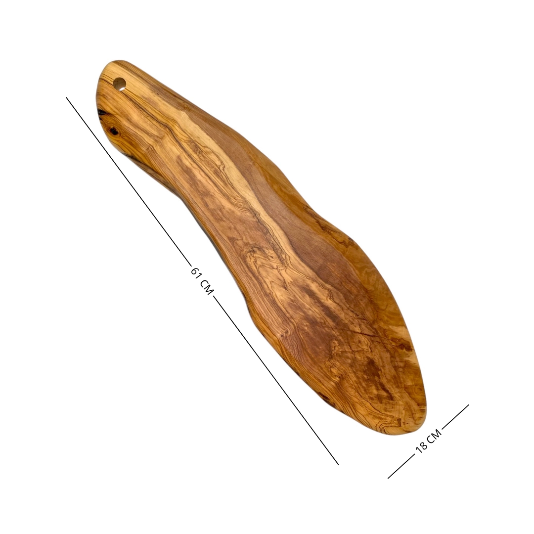Questo tagliere grande in legno massello di ulivo è un pezzo unico che unisce estetica naturale e funzionalità professionale. La sua forma irregolare segue il profilo autentico del legno, esaltando nodi, venature marcate e sfumature calde tipiche dell’ulivo. Ogni tagliere è diverso dall’altro, rendendolo un accessorio esclusivo per la tua cucina. Grazie alle dimensioni generose, offre un’ampia superficie ideale per tagliare pane, carne, verdure o per servire antipasti e taglieri misti in modo elegante e scenografico. Il pratico foro permette di appenderlo facilmente, trasformandolo in un elemento decorativo rustico quando non in uso. Robusto, resistente e durevole, è perfetto per chi cerca qualità artigianale e materiali naturali. Ideale anche come idea regalo, questo tagliere grande in ulivo dona carattere e calore a qualsiasi ambiente cucina.