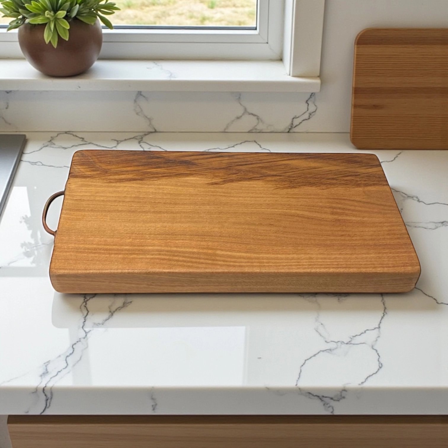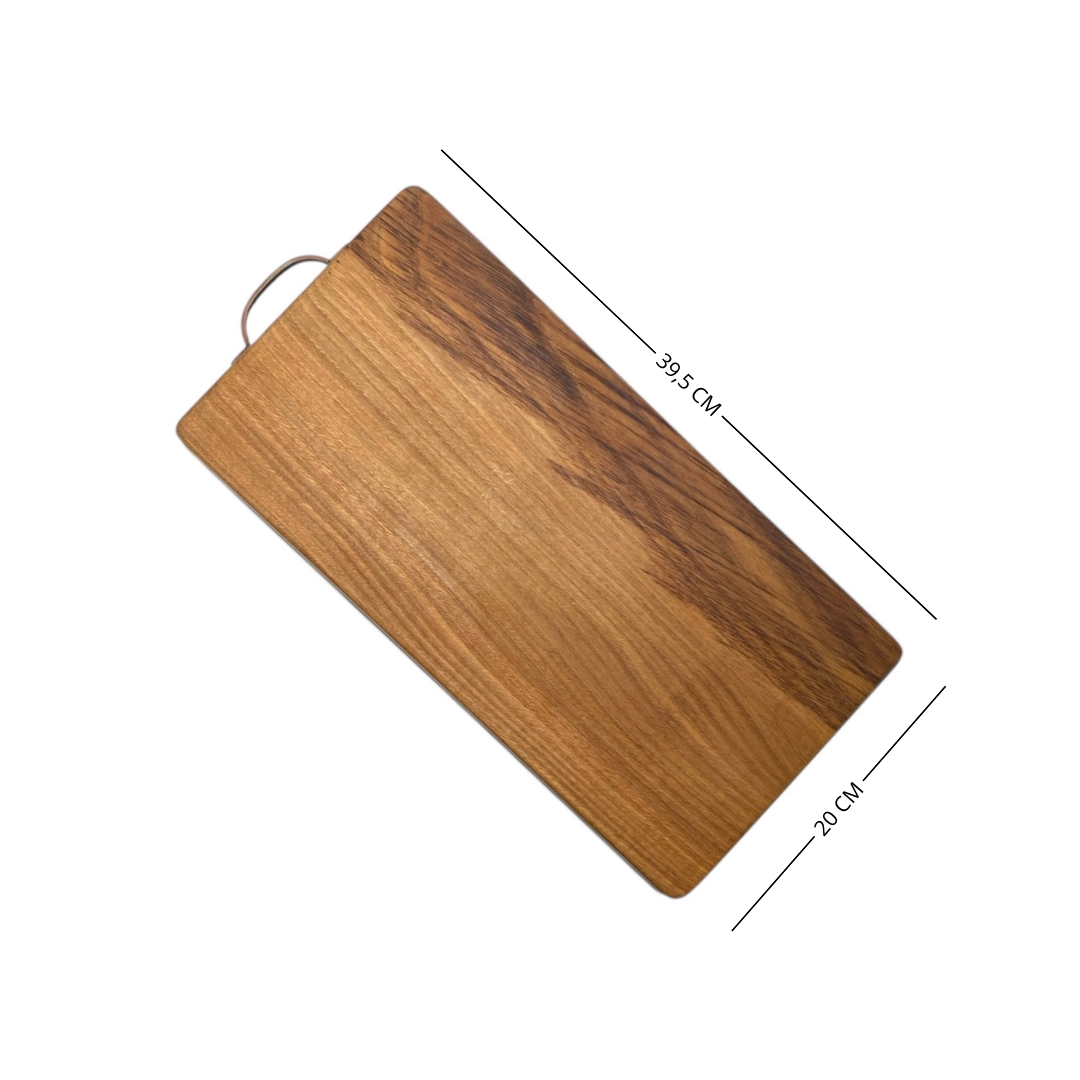 La finitura liscia valorizza le venature naturali del legno, rendendo ogni pezzo unico e irripetibile. La maniglia in metallo integrata consente una presa sicura e funzionale, facilitando lo spostamento e permettendo di appendere il tagliere quando non è in uso.
