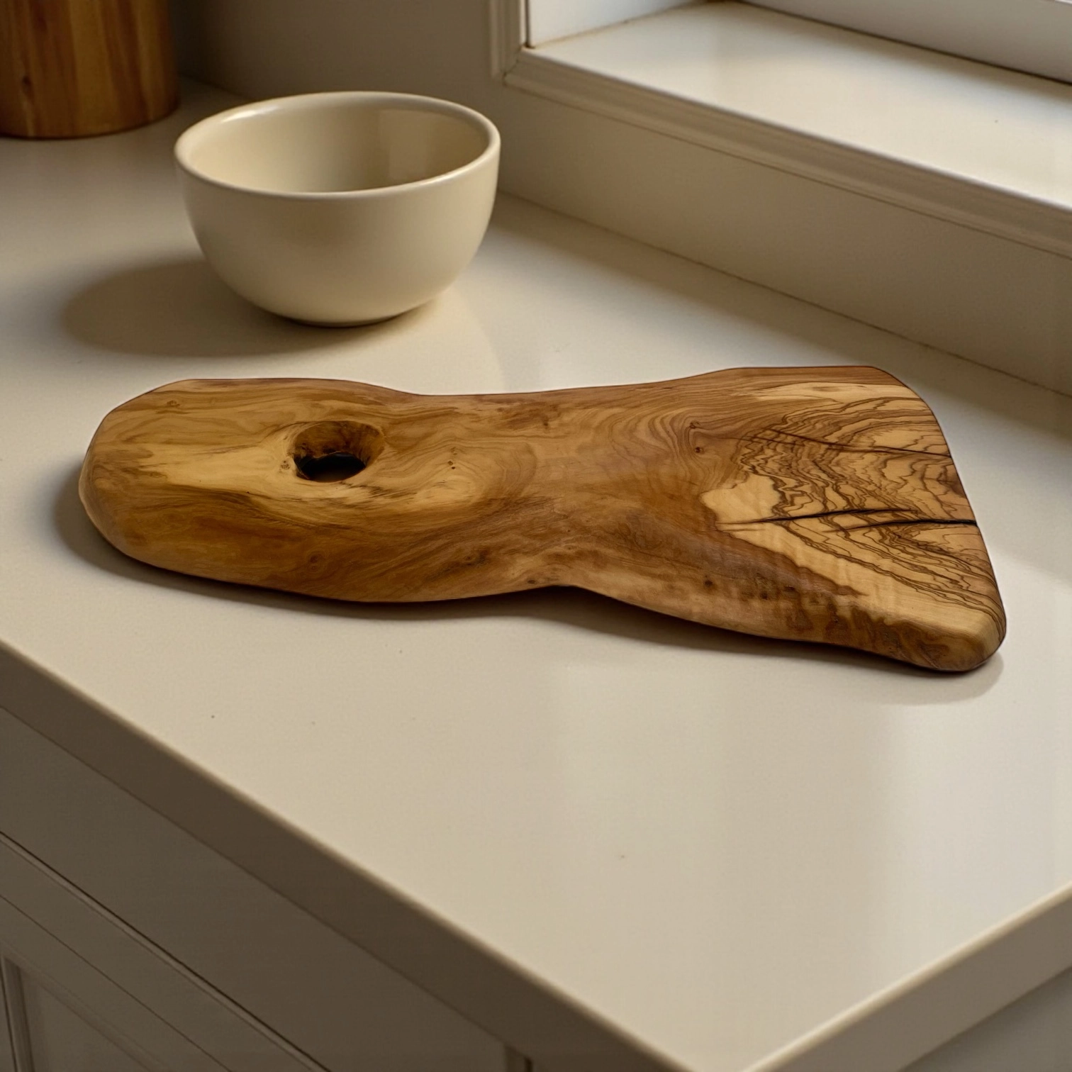 Realizzato a mano, conserva la forma irregolare originale del legno, valorizzando le venature calde e i toni dorati tipici dell’ulivo. Ogni pezzo è unico, con profili morbidi e imperfetti che raccontano la storia e la vita dell’albero da cui proviene.