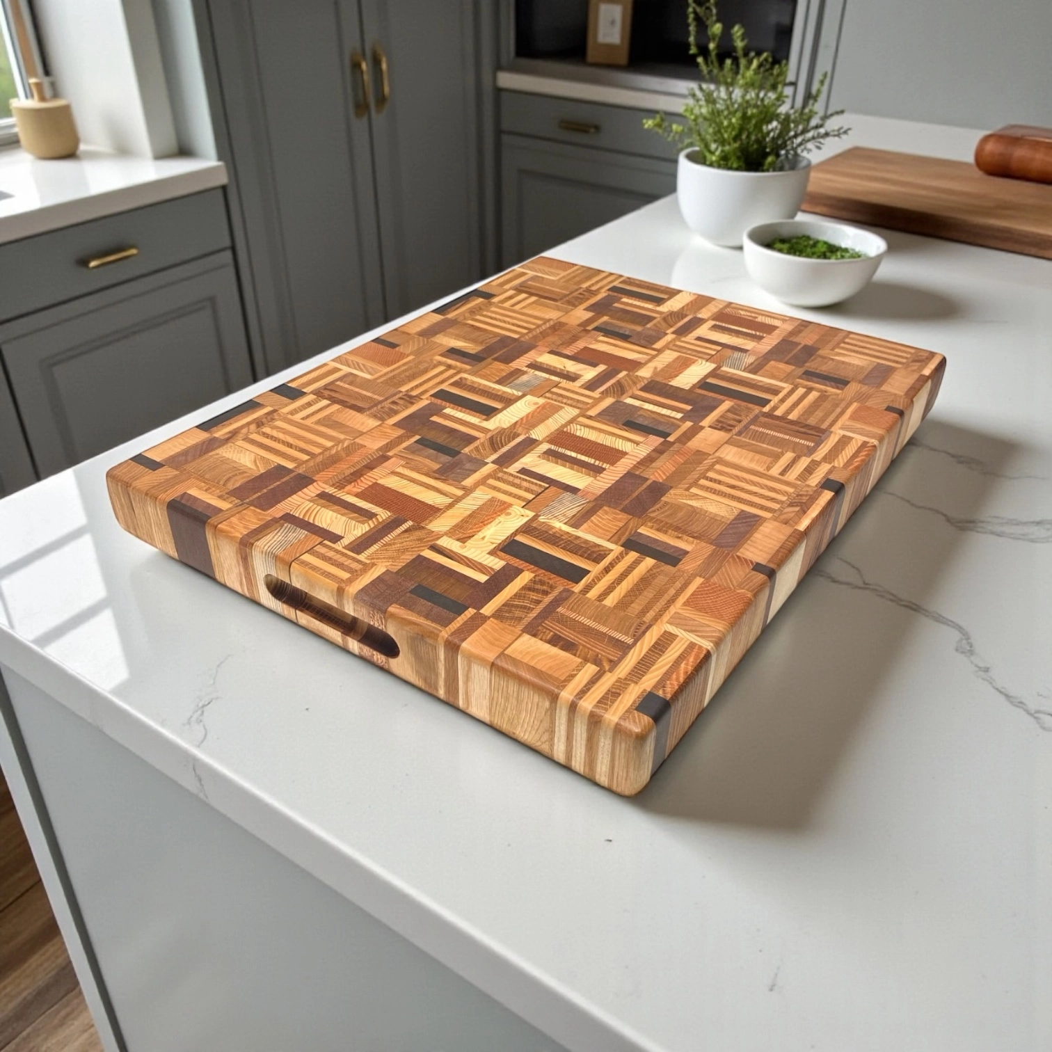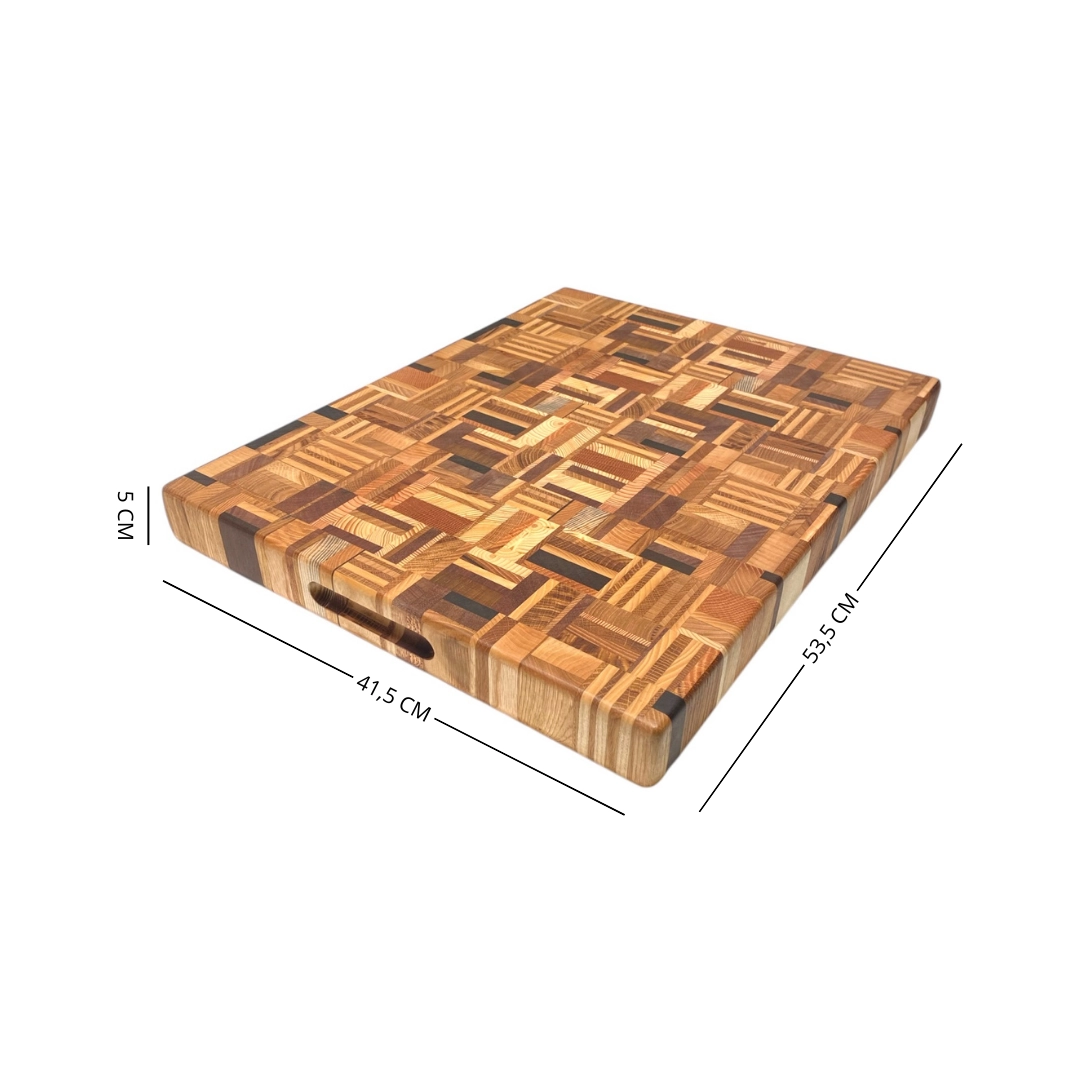 La lavorazione “di testa” rende il tagliere estremamente resistente e funzionale: le fibre verticali del legno assorbono meglio i colpi del coltello, preservando la lama e garantendo una lunga durata nel tempo. Pensato per un utilizzo professionale ma perfetto anche in ambito domestico, unisce solidità, stabilità ed eleganza.