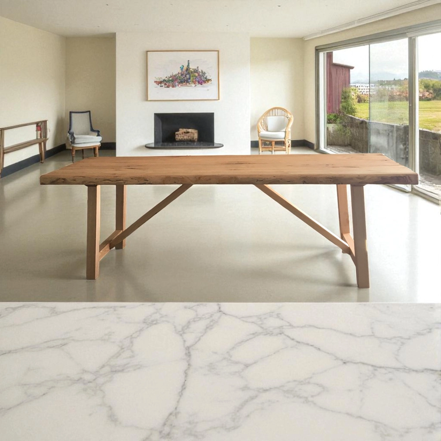 Il piano, spesso 6 cm, valorizza la matericità del castagno con venature, nodi e imperfezioni naturali che raccontano la storia del legno e rendono ogni tavolo un pezzo unico. Il basamento a capretta, solido e funzionale, richiama l’estetica dei tavoli rustici di un tempo, reinterpretata in chiave elegante e contemporanea.