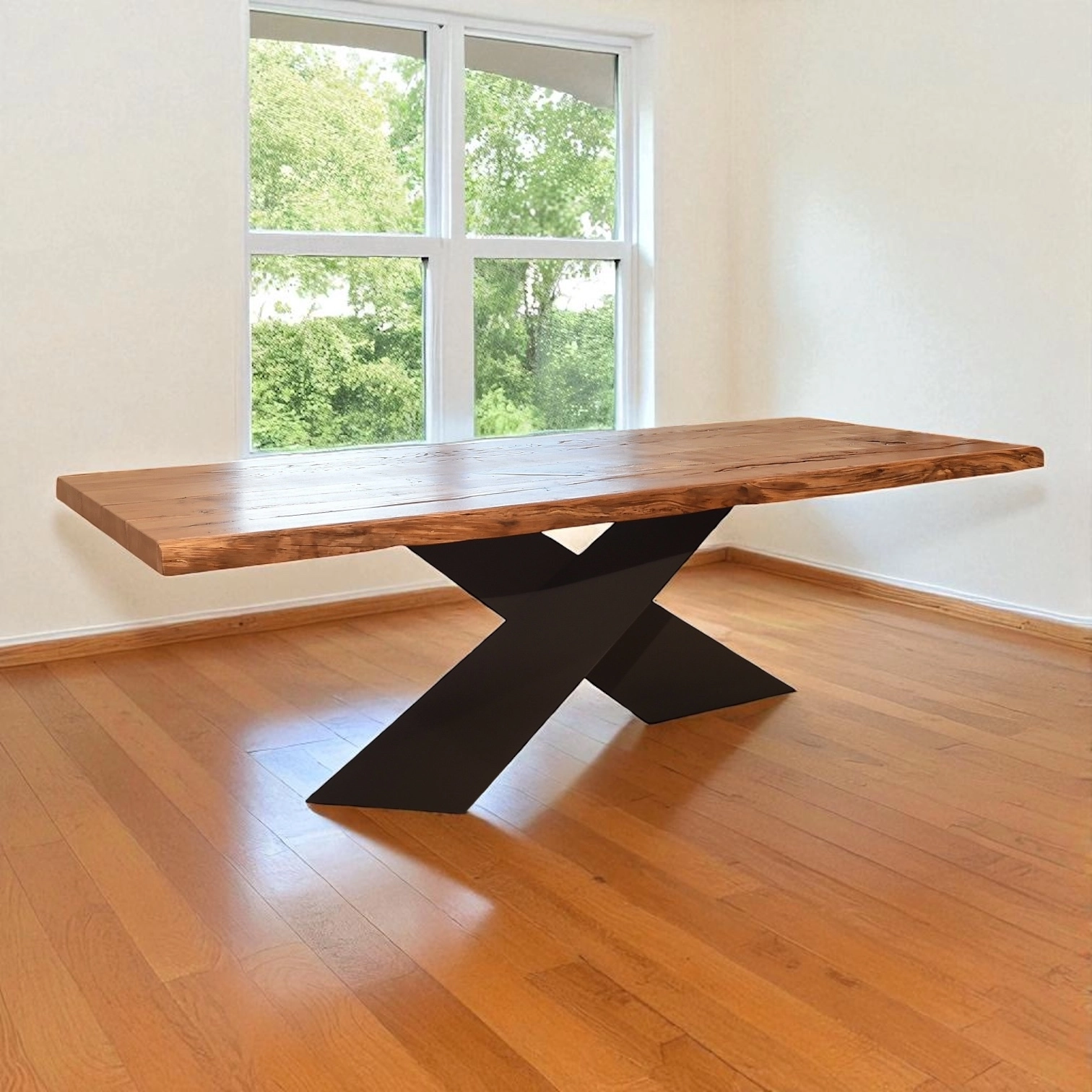La solida gamba a croce con finitura effetto ferro conferisce un carattere deciso e contemporaneo, creando un perfetto equilibrio tra rusticità e stile industrial. Ogni tavolo è lavorato interamente a mano da artigiani specializzati: piccole differenze di forma, colore e dimensione sono il segno distintivo della sua autenticità.