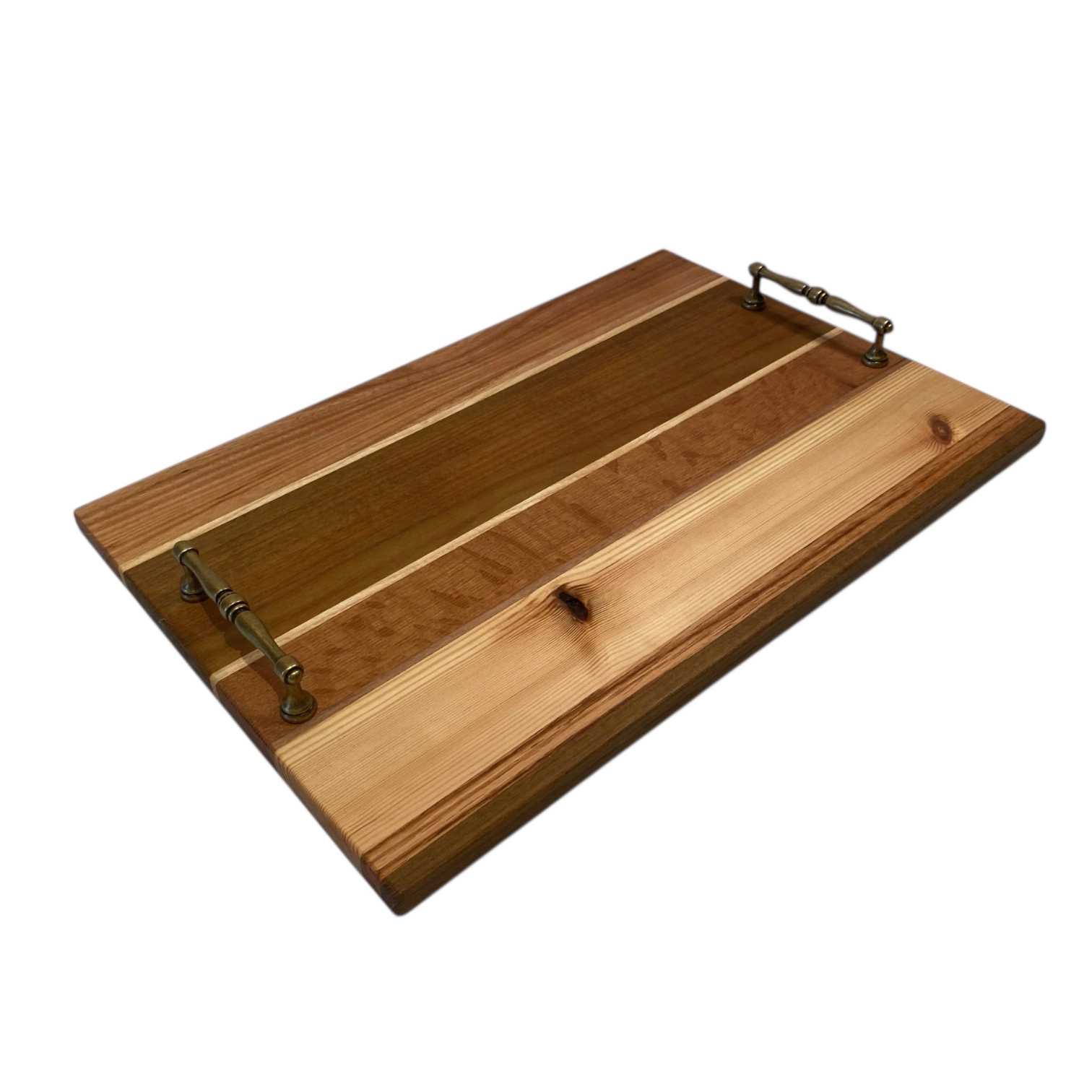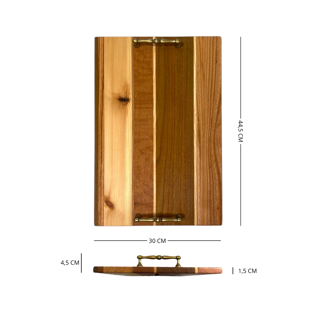 Vassoio artigianale in legni misti con maniglie bronzo.