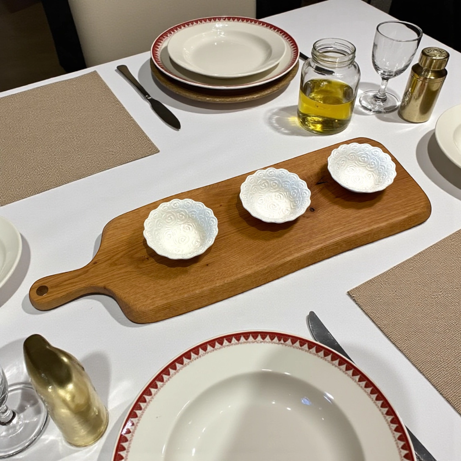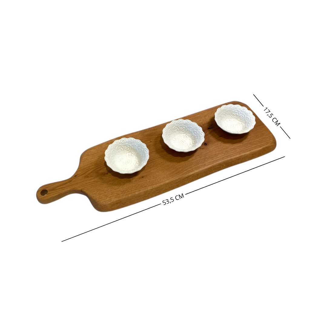 Realizzato a mano, presenta una solida base con tre sedi scavate su misura per le ciotoline incluse, perfette per servire salse, aperitivi, confetture o spezie. Il pratico manico laterale consente una presa comoda e sicura, rendendolo ideale per portare in tavola con stile e praticità.