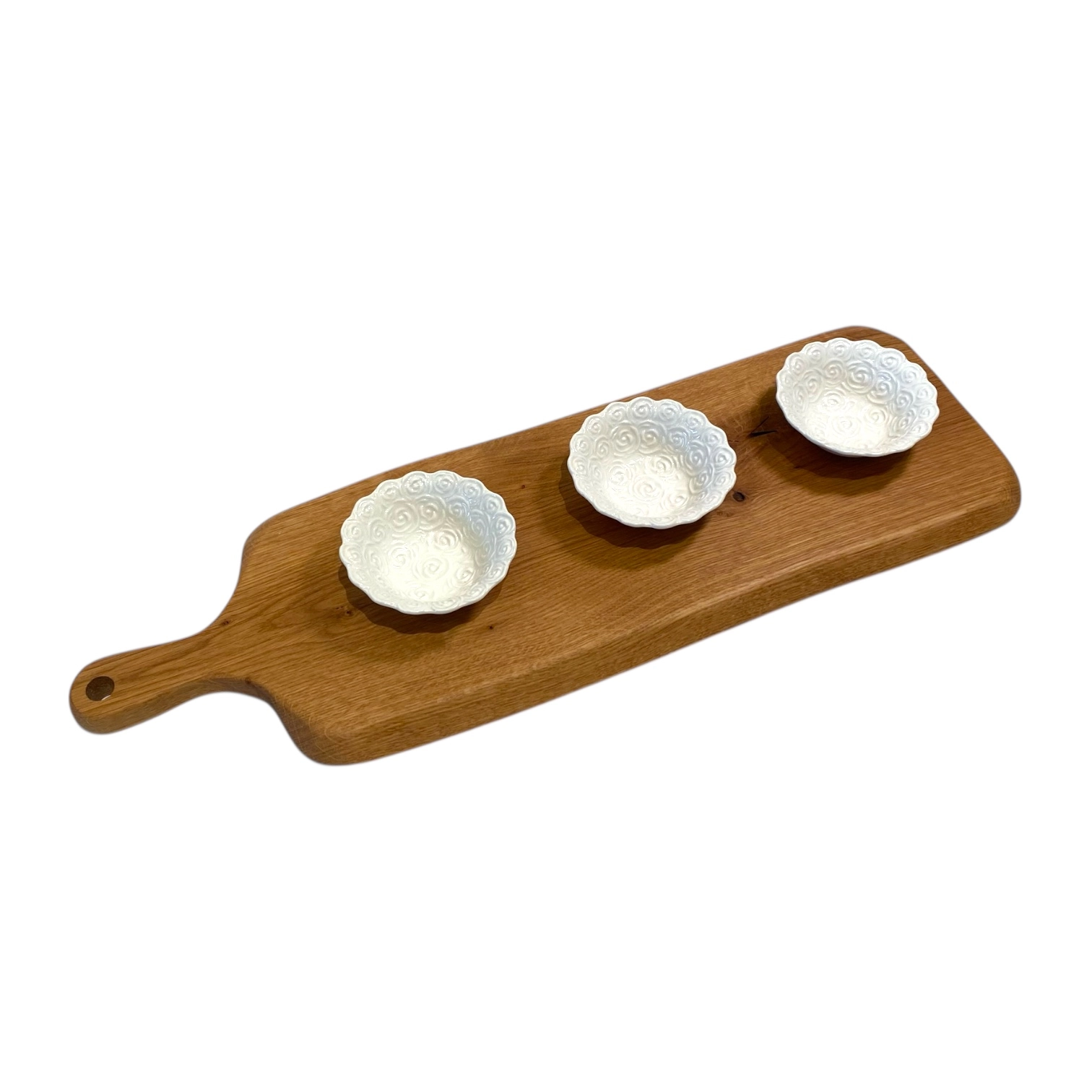 Vassoio artigianale in legno massello con manico e tre ciotoline, perfetto per servire salse, aperitivi o degustazioni.