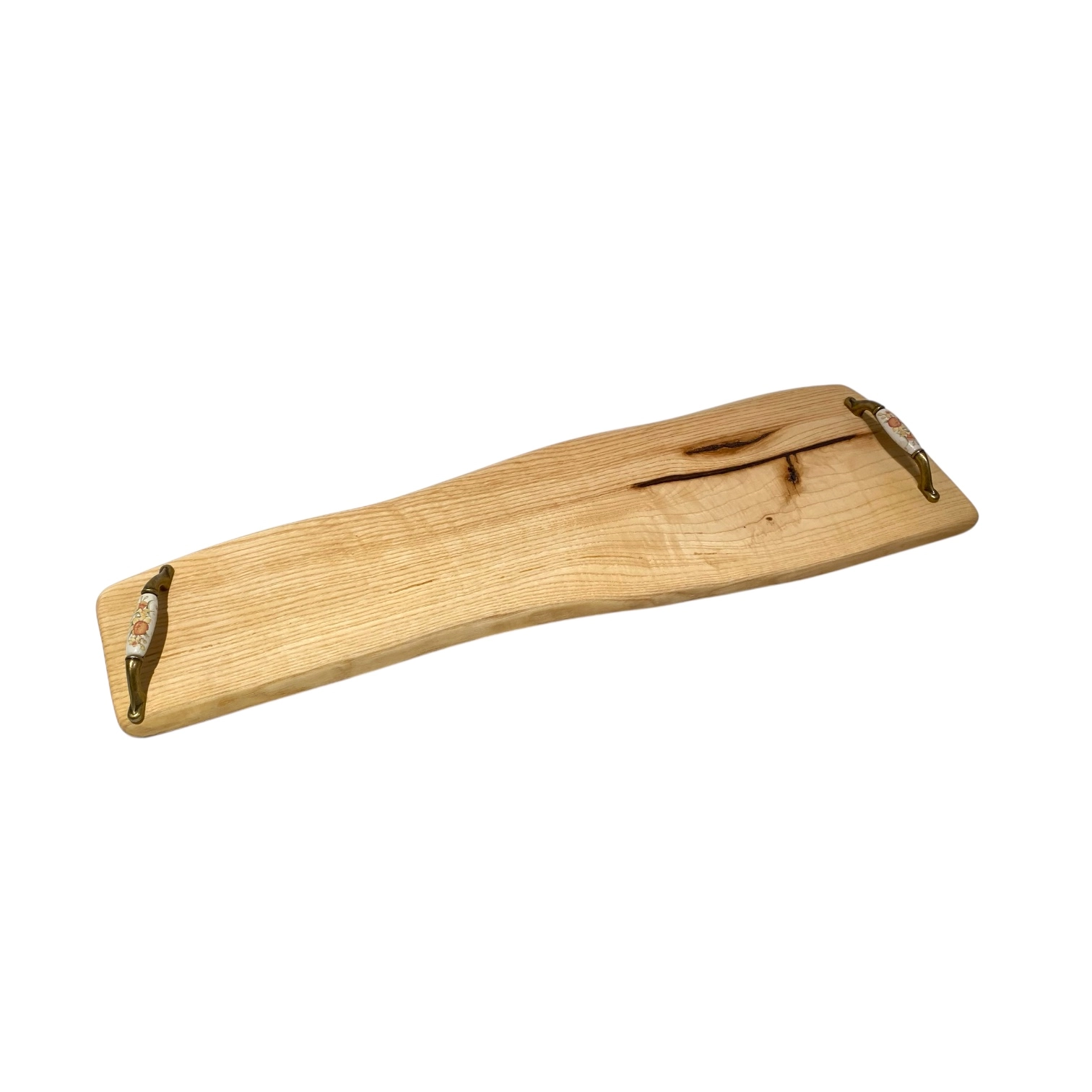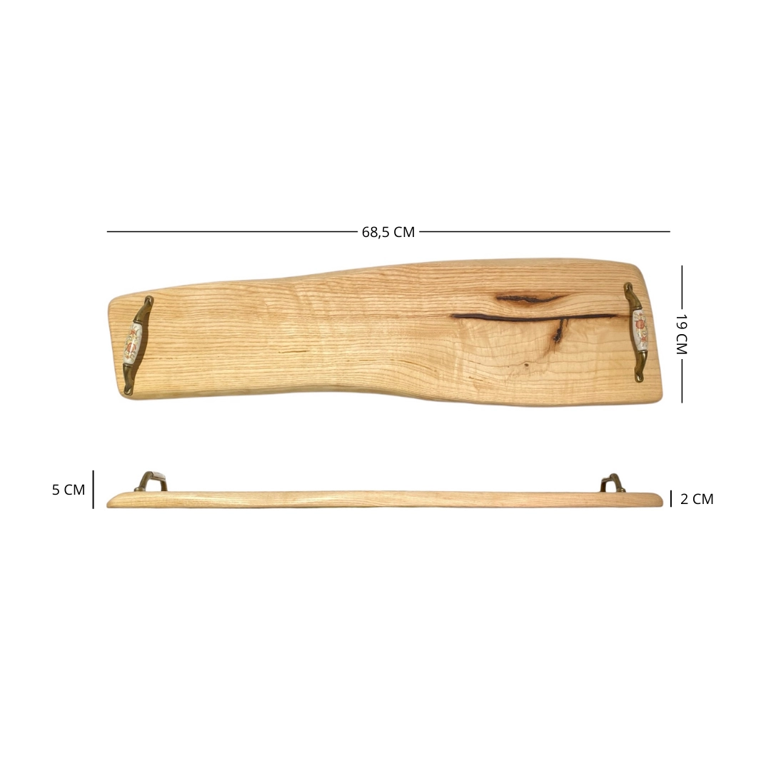 Vassoio stretto e lungo in legno massello di frassino con maniglie e bordi irregolari.